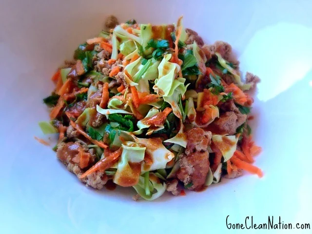 This morning when I was ready to make my lunch, I washed and chopped my Napa cabbage. Then I grated one large carrot, and chopped a healthy handful of cilantro. Mixed it altogether in a bowl. Then I tossed my pre-cooked ground turkey on top, and added about 1 1/2 tablespoons of dressing. It was INSANELY good!
