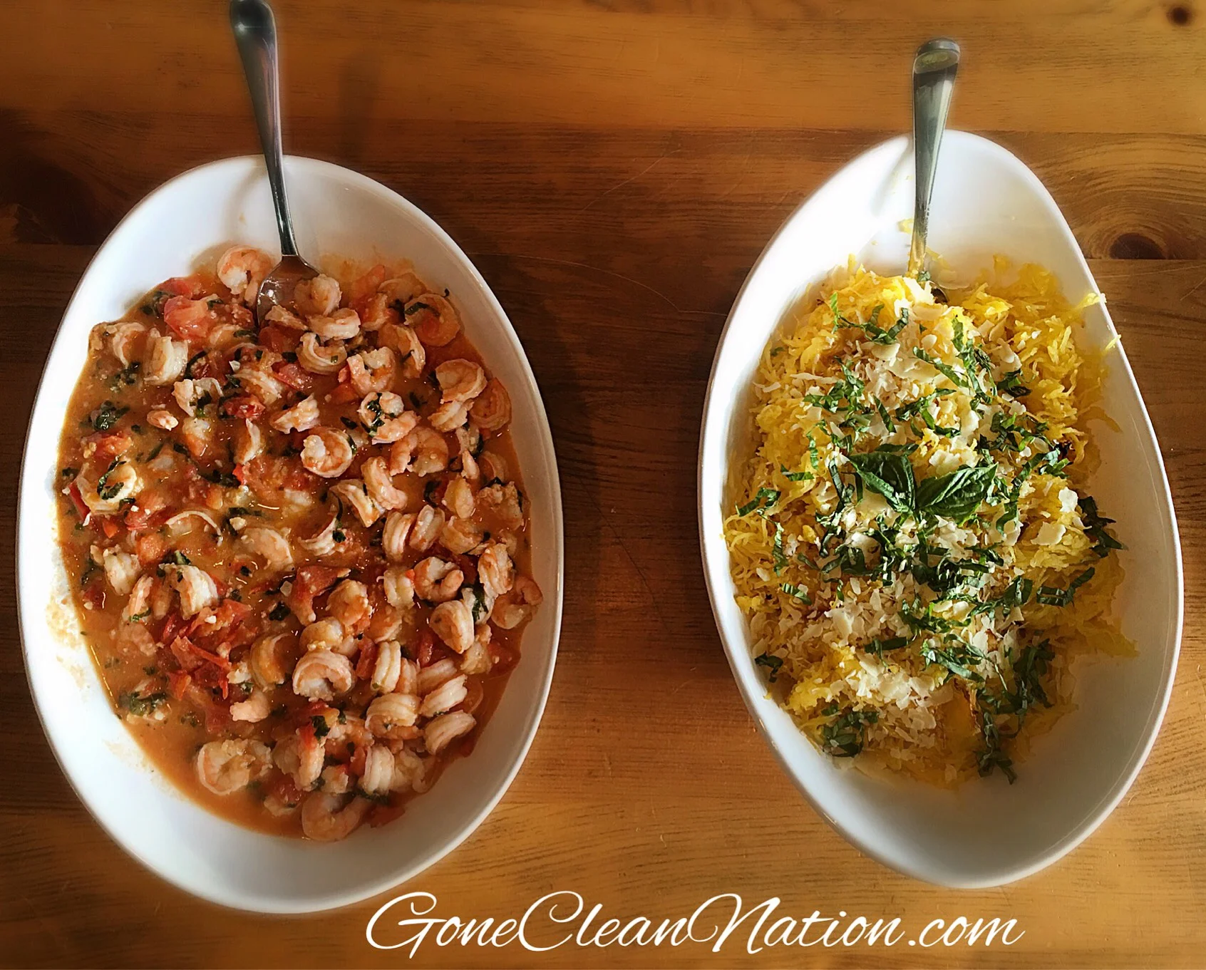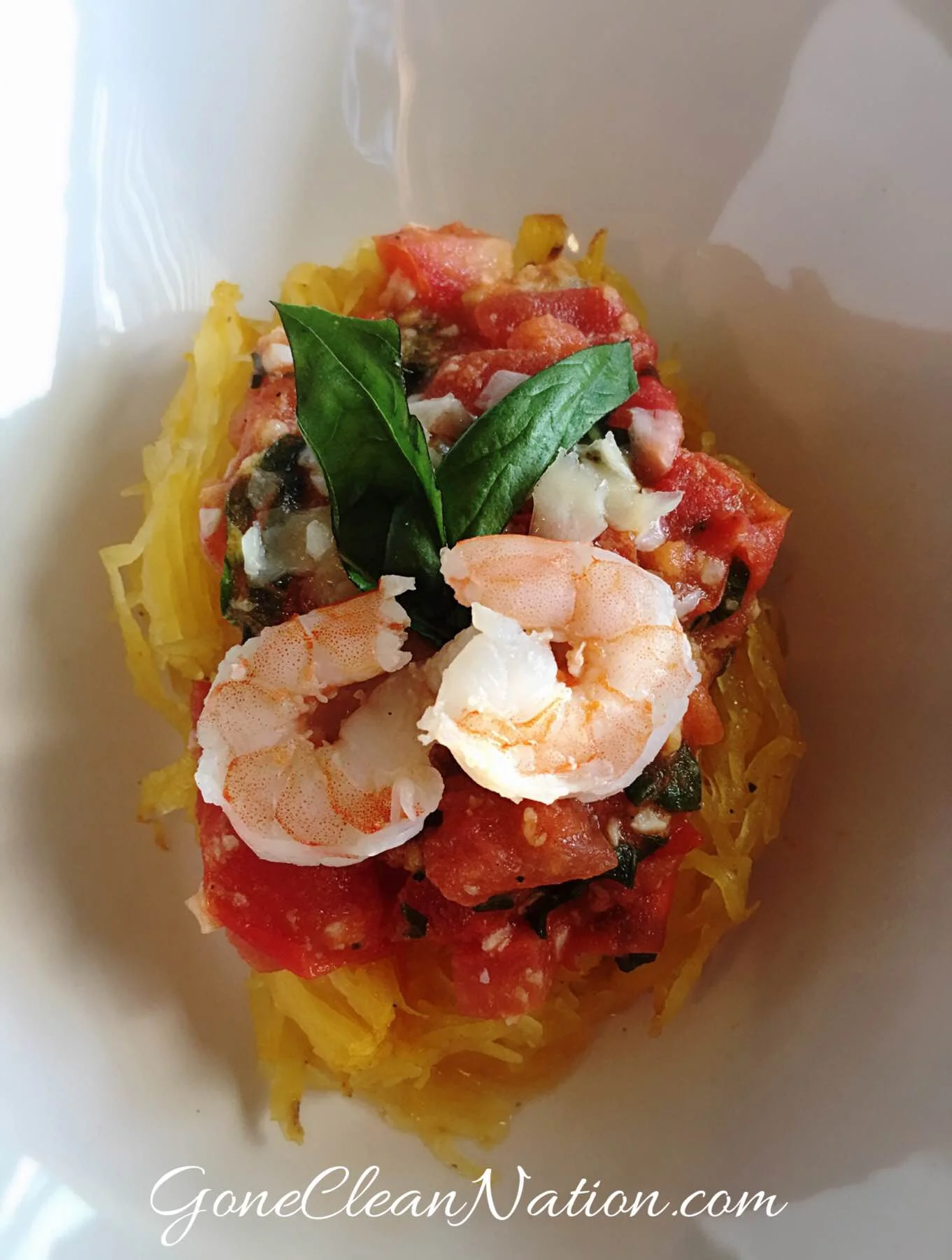Scoop out spaghetti squash and serve on plates. Top with tomato/wine sauce/shrimp mixture. Then add a tbls of fresh chopped basil and split remaining fresh grated Parm to the top of each dish. Serve immediately! Enjoy!