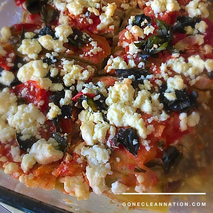 Oil a large, shallow baking dish (about 9 x 13) use the remaining 1 tsp of oilive oil and grease the pan. Then lay half of the zucchini, and then 1/2 the eggplant in the dish and spread one half of the tomato mixture on top. Scatter with half of the feta and basil. Layer the other half of the zucchini on top, and then the other 1/2 of the eggplant. Top with the remaining tomato, feta, and basil. Bake for 20-25 minutes, until bubbling and feta is melty. Let stand for 5 minutes, then serve hot or warm.