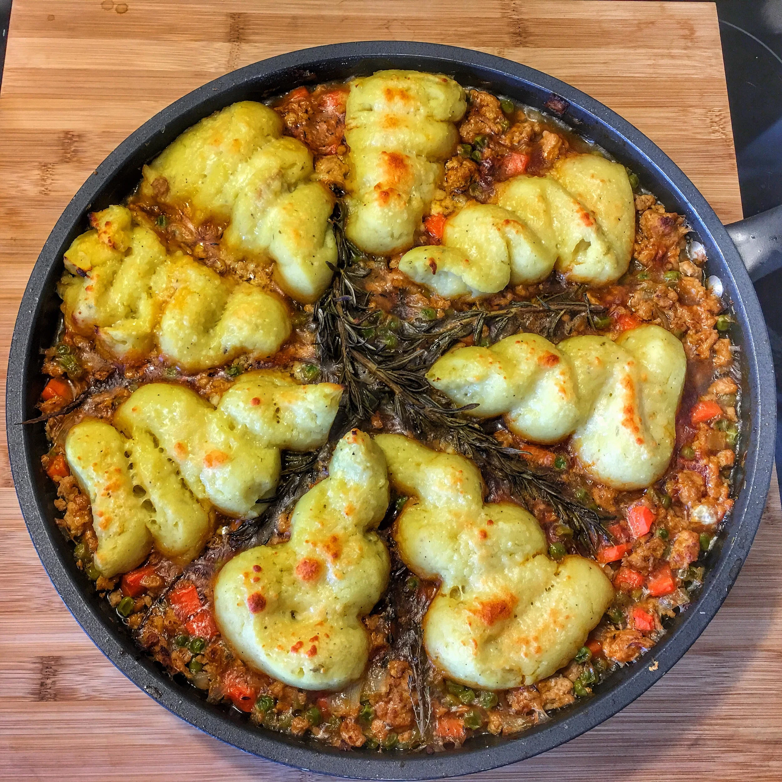 5. Place the sprigs of rosemary and thyme on top of the meat and gently push them in. Just so they are barely covered by the meat . Then Arrange scoops of mashed potatoes on top. Dust the top of the potatoes with the Parmesan cheese.